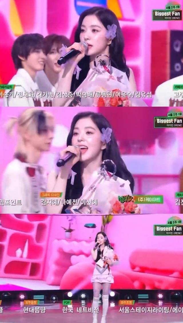 아이린은 지난 10일 방송된 KBS2 '뮤직뱅크'에서 정규 1집 타이틀곡 'Biggest Fan'으로 1위를 거머쥐며 솔로 데뷔 이후 첫 음악방송 정상에 올랐다.