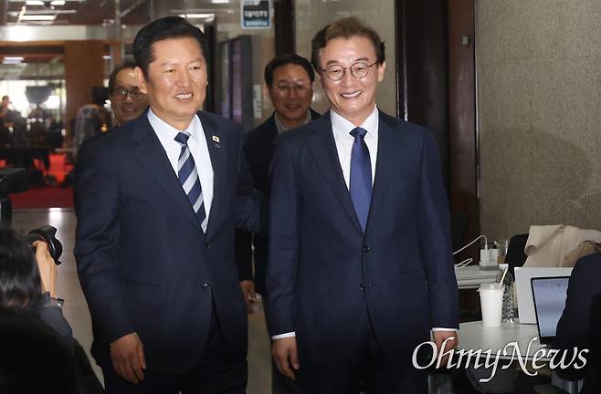 | ▲ 더불어민주당 부산시장 후보로 선출된 전재수 의원이 10일 오후 서울 여의도 국회에서 정청래 더불어민주당 대표를 예방했다. 이날 정 대표는 당대표실 복도에 직접 마중 나와 전 의원을 포옹하며 반겼다. |