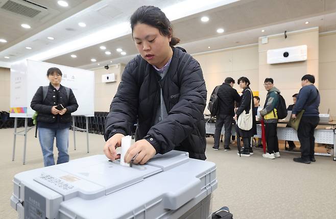 10일 서울 여의도 이룸센터 이룸홀에서 중앙선거관리위원회 주최로 열린 '장애인유권자 참정권 보장 정책간담회'에 앞서 참석자들이 모의사전투표 체험을 하고 있다.