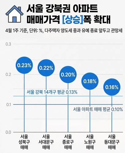강북 14개구(0.13%)는 성북구(0.23%)가 길음·정릉동 대단지 위주로, 서대문구(0.22%)는 남가좌·북아현동 위주로, 종로구(0.20%)는 무악·창신동 역세권 위주로 올랐다. 노원구(0.18%)와 동대문구(0.16%)도 상승세를 이어갔다.