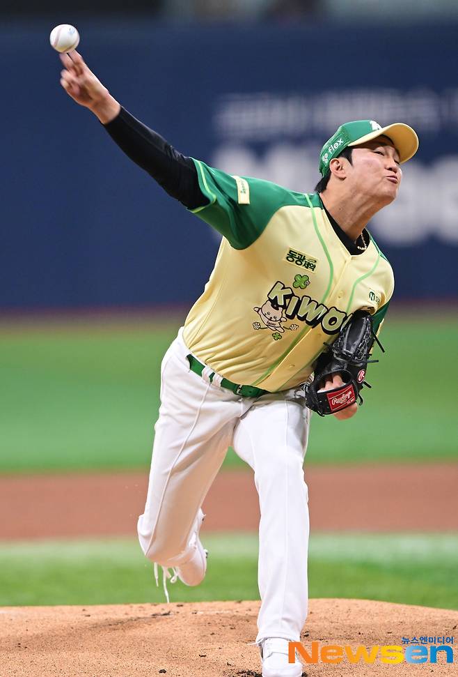 안우진은 1회 선두타자 황성빈에게 초구 시속 157km 직구를 한가운데 던지며 경기를 시작했다.
