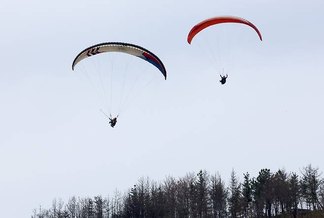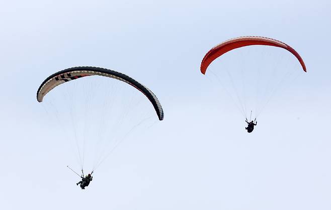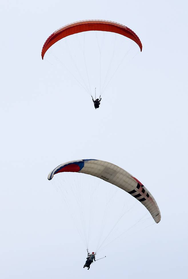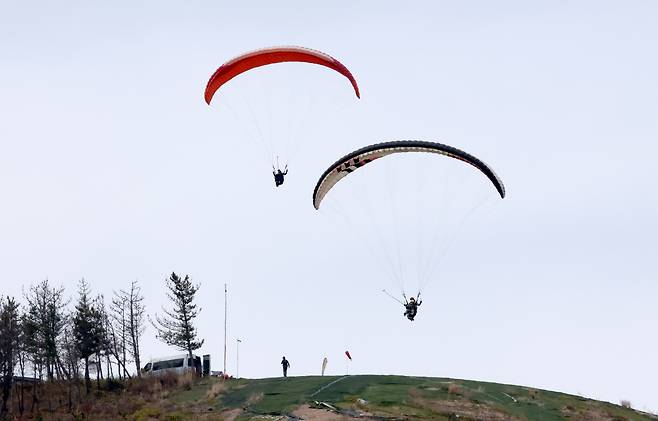 전형적인 4월의 봄 날씨를 보인 12일 오후 포항시 북구 흥해읍 칠포해수욕장 상공에서 패러글라이딩 동호인들이 봄 하늘을 날고 있다. /이용선기자 photokid@kbmaeil.com