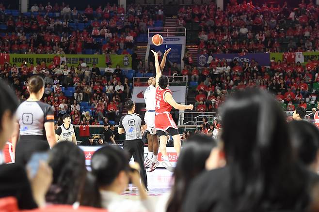 차분했던 라커룸 분위기와 달리 경기장은 금세 달아올랐다. 옆동네에서 몰려든 소노 팬들이 관중석 절반 가까이를 꽉 채운 채 응원 기싸움에서 밀리지 않았다. 오히려 고막이 찢을 듯한 함성도 소노 응원석에서 더 컸다.