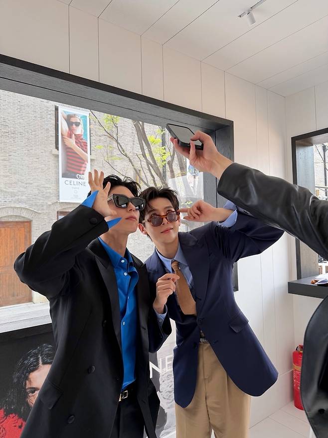 이날 박보검은 선명한 블루 셔츠에 블랙 더블 브레스트 재킷을 매치하여 세련되면서도 클래식한 ‘셀린느 보이’의 정석을 보여주었다.
