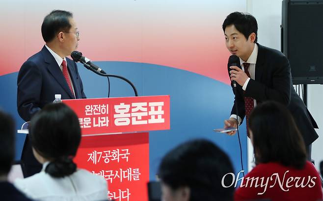 | ▲ 이성배, '홍준표 선진대국시대 비전발표회' 진행 홍준표 캠프에 합류한 이성배 전 MBC 아나운서가 17일 오후 서울 영등포구 홍준표 경선캠프에서 열린 국방-외교-통일 분야에 대한 '선진대국시대 비전발표회'에서 진행을 하고 있다. |