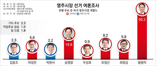 반면, 영주에서는 전혀 다른 양상이 나타났다. 지난 9일 영주에 거주하는 만 18세 이상 남녀 503명을 대상으로 실시한 같은 조사에서 영주시장 후보 적합도를 묻는 질문에 황병직 전 경북도의회 문화환경위원장이 50.2%를 기록하며 압도적 1위를 차지했다. 2위인 송명달 전 해양수산부 차관(19.8%)과의 격차는 2배를 훨씬 넘는 30%포인트 안팎으로 크게 벌어져 사실상 독주 체제가 구축된 모습이다.