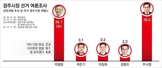 대구일보가 여론조사회사인 리서치웰에 의뢰해 지난 9~10일 경주에 거주하는 만 18세 이상 남녀 501명을 대상으로 무선 가상번호로 실시한 조사에서 경주시장 국민의힘 후보 적합도를 묻는 질문에 주낙영 경주시장이 38.6%, 박병훈 국민의힘 중앙위원회 상임고문이 36.7%로 집계됐다. 두 후보 간 격차는 1.9%포인트로 오차범위 내 초박빙이다.