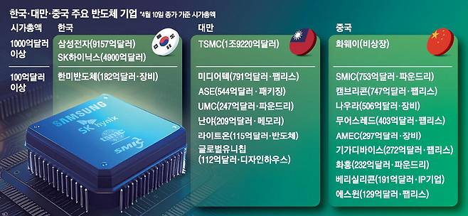 세계 최대 반도체 제조기업 TSMC가 있는 대만은 TSMC 한 회사의 시총이 1조7000억달러에 달할 정도로 쏠림이 심하다. 하지만 허리에 해당하는 100억~1000억달러 가치 반도체 기업의 숫자는 한국보다 훨씬 많다.