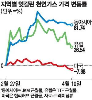 미국·이란 전쟁 발발 이후 발전 연료로 많이 사용되는 천연가스 가격이 지역별로 크게 벌어지고 있다. 천연가스를 생산해 사용하는 미국의 경우 가격이 떨어졌지만, 이를 주로 수입해서 사용하는 동아시아와 유럽에선 가격이 크게 상승했기 때문이다.
