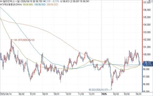 연합인포맥스의 달러인덱스 및 이종통화 등락률 비교(화면번호 6400번, 6443번)에 따르면, 지난 10일(이하 현지시간) 기준 주요 6개국 통화에 대한 달러화 가치를 나타내는 달러인덱스(DXY)는 전주대비 1.481포인트(1.48%) 내린 98.703에 거래를 끝냈다.