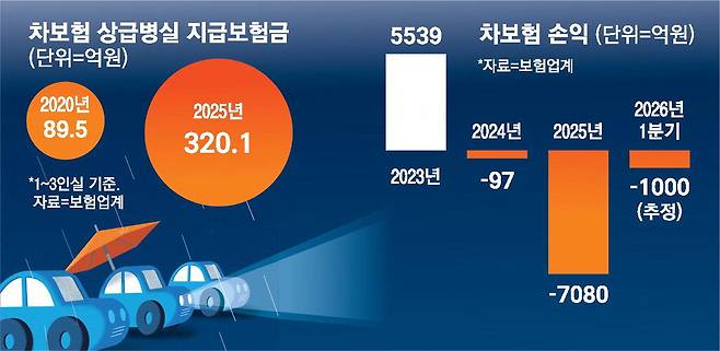 12일 매일경제가 주요 손보사와 손해보험협회 등을 취재한 결과, 올해 1분기 국내 손보사들의 자동차보험 부문 영업적자는 1000억원 안팎에 달할 것으로 집계됐다. 대형 손보사들조차 각각 수백억 원대 적자를 기록할 것으로 알려졌다. 작년엔 1분기 흑자를 기록했음에도 연간 7080억원의 적자를 냈는데, 올해는 시작부터 적자라 대규모 손실이 불가피하다는 관측이다.