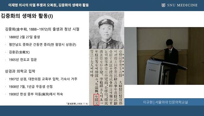 | ▲ 서울대학교 의과대학 유튜브에 올라온 이규원 서울대 의대 인문의학교실 객원교수의 <이재명 의사의 의열투쟁과 오복원, 김중화의 생애와 활동> 발표 중 일부 |