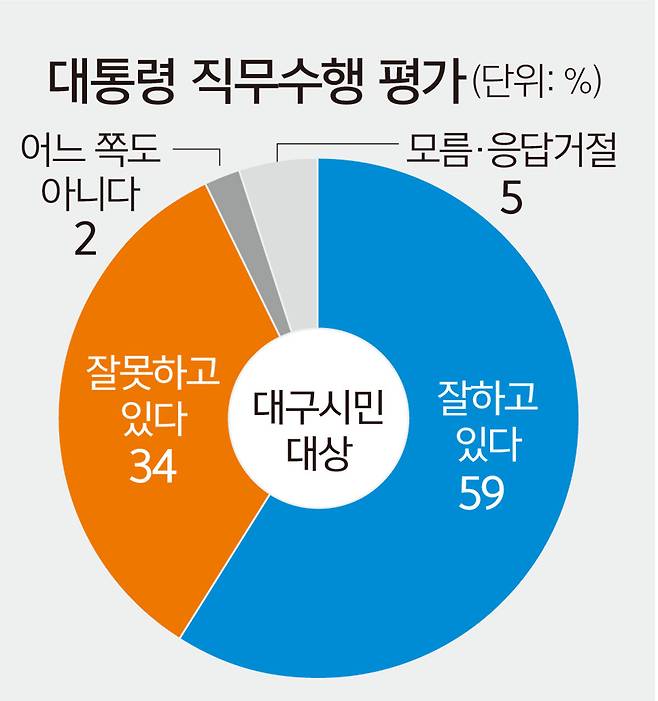 세계일보가 한국갤럽에 의뢰해 지난 10∼11일 대구의 18세 이상 유권자 805명을 대상으로 실시한 이 대통령 직무수행 평가 조사에서 대구 시민의 59%가 ‘잘하고 있다’고 응답한 것으로 나타났다. ‘잘못하고 있다’는 응답은 34%로, 긍정 평가가 부정 평가를 크게 앞선 것으로 분석된다.