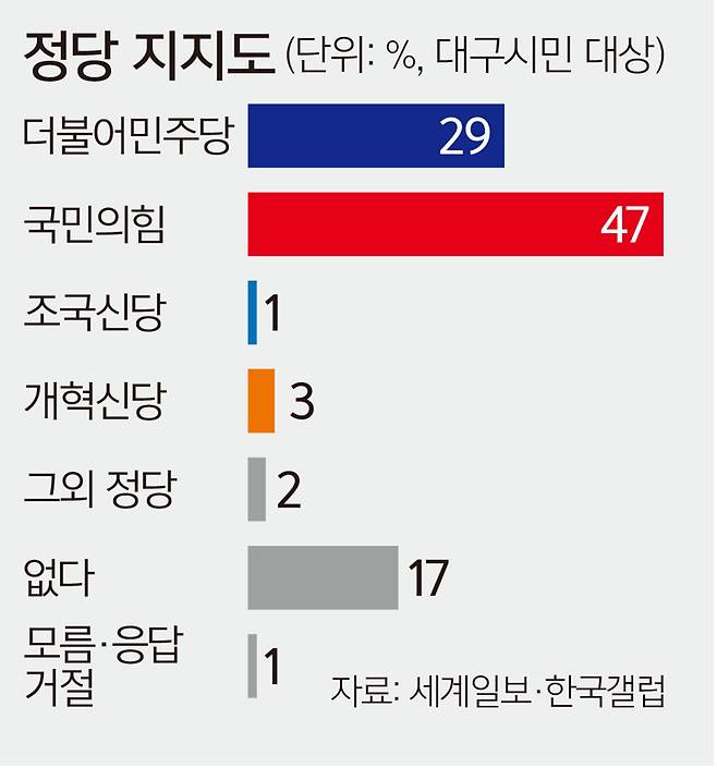 정당 지지도 조사에서 대구 시민들은 여전히 국민의힘에 더 높은 지지를 보냈다. 국민의힘은 47%, 민주당은 29%를 기록했다. 이 대통령의 국정 운영에는 높은 지지를 보내면서도 여당인 민주당에는 상대적으로 낮은 평가를 내리는 흐름으로 풀이된다. 다만 무당층(‘지지정당 없음’과 ‘모름·응답거절’ 합산)이 17%에 달해 적잖은 비중을 차지했다.