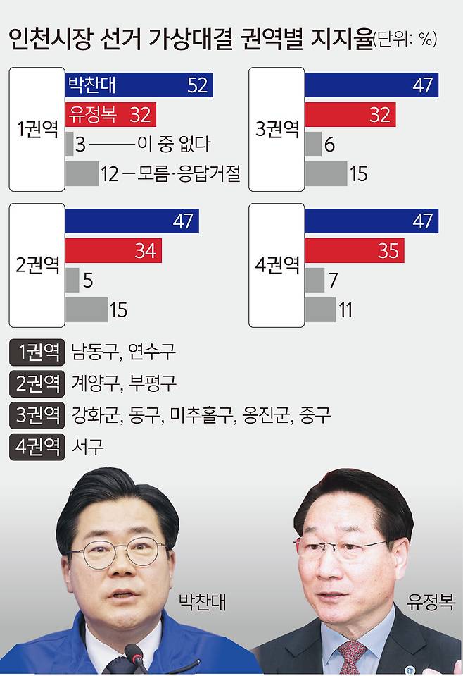 12일 세계일보가 한국갤럽에 의뢰해 인천지역 유권자를 대상으로 진행한 여론조사에서 응답자의 49%는 이번 선거에서 민주당 박 후보를 지지한다고 답했다. 국민의힘 유 후보는 33%를 기록해 박 후보가 오차범위(±3.4%포인트) 밖에서 앞섰다. ‘지지 후보 없음’과 ‘모름·응답거절’을 합한 무당층은 18%였다.