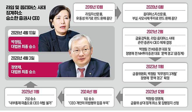 대법원은 지난 10일 라임펀드 사태와 관련해 박정림 전 KB증권 대표에게 내려진 중징계를 취소해야 한다는 원심 판단을 확정했다. 3일 정영채 전 NH투자증권 대표도 옵티머스 사태와 관련한 징계 취소 소송에서 1·2심에 이어 대법원까지 승소했다.