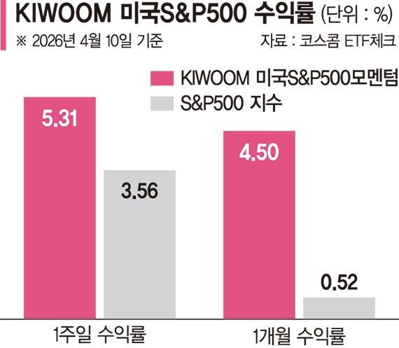 12일 코스콤ETF체크에 따르면 지난 10일 기준 'KIWOOM 미국S&P500모멘텀'의 1주일 수익률은 5.31%, 1개월 수익률은 4.50%이다. 같은 기간 S&P500 지수가 각각 3.56%, 0.52% 상승한 것 대비 높은 성과다.