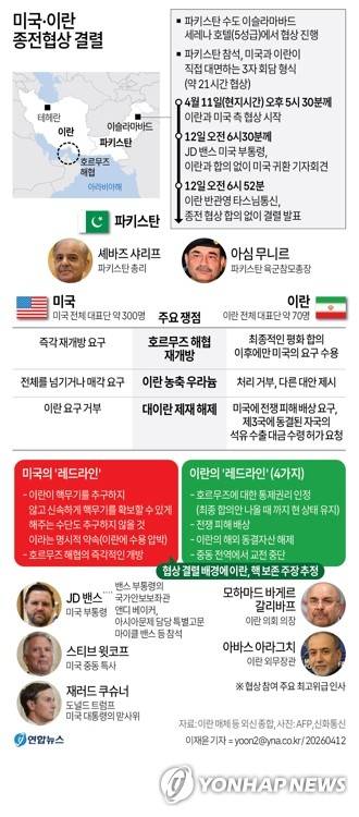 (서울=연합뉴스) 이재윤 기자 = 호르무즈 해협, 이란 농축 우라늄, 제재 해제 문제를 놓고 미국과 이란의 입장이 대립하면서 11∼12일(현지시간) 파키스탄에서 열린 첫 종전 협상이 결렬된 것으로 전해졌다.