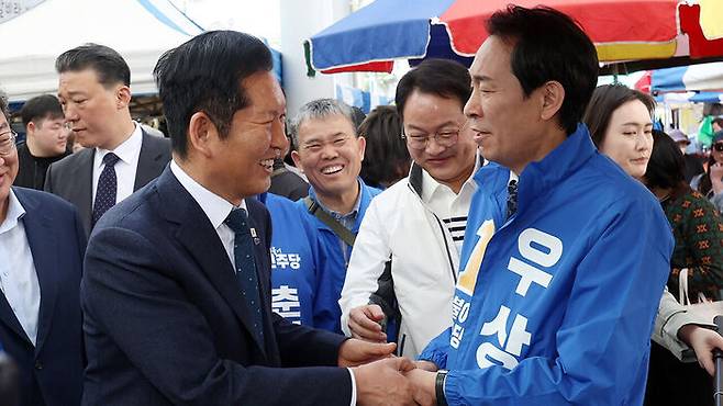 정 대표는 시장 곳곳을 돌며 "강원도지사 후보는 우상호" 등 구호를 외치며 우 후보를 밀착 지원했습니다.