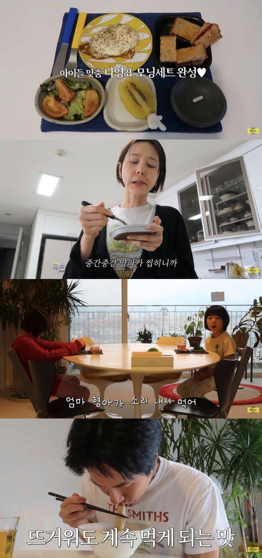 김나영은 골드키위, 계란후라이, 라즈베리 토스트까지 요리해 모닝세트를 선보였다. 이준이는 “먼저 유산균을 먹어보겠다”라며 카메라를 향해 공복에 유산균을 먹은 뒤 엄마표 아침을 먹었다.