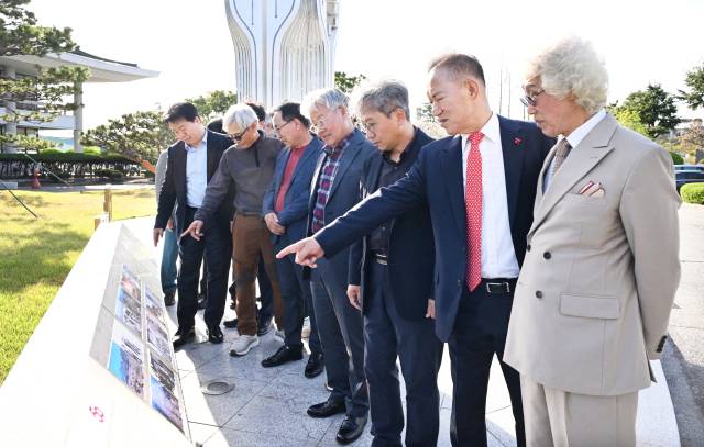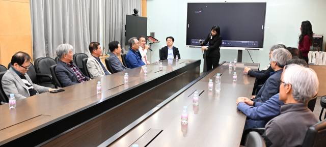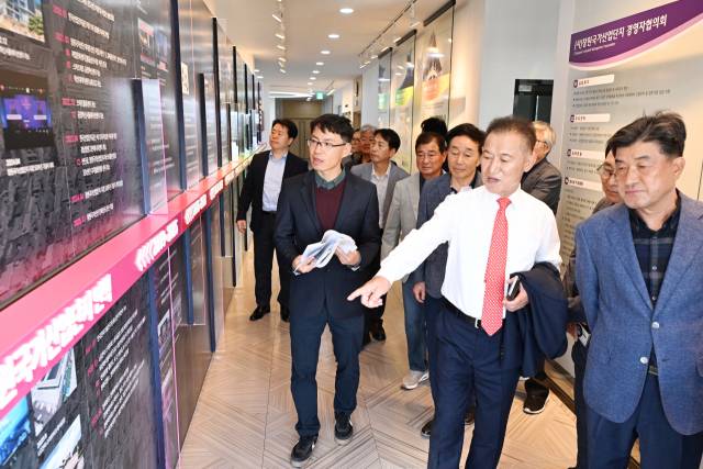 이날 한국산업단지공단 경남지역본부 6층 창원공단 역사관에서 김은철 경남지역본부장으로부터 전시물에 대해 설명을 듣고 있는 근로자들./전강용 기자/