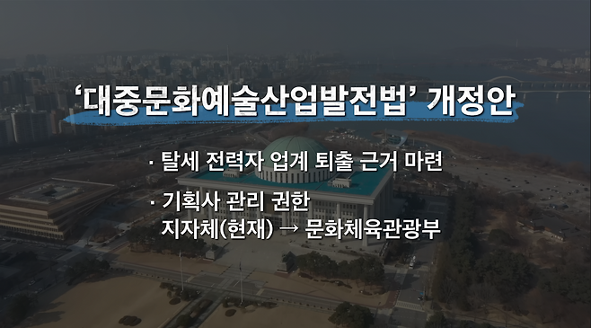 국회 문체위 소속 정연욱 의원이 대표 발의한 ‘대중문화예술산업발전법’ 개정안은 탈세 전력자가 업계에 발붙이지 못하도록 법적 근거를 마련하는 것이 핵심인데, 지자체에 분산되어 있던 기획사 관리 권한을 주무 부처인 문화체육관광부로 일원화하는 게 주된 내용입니다.
