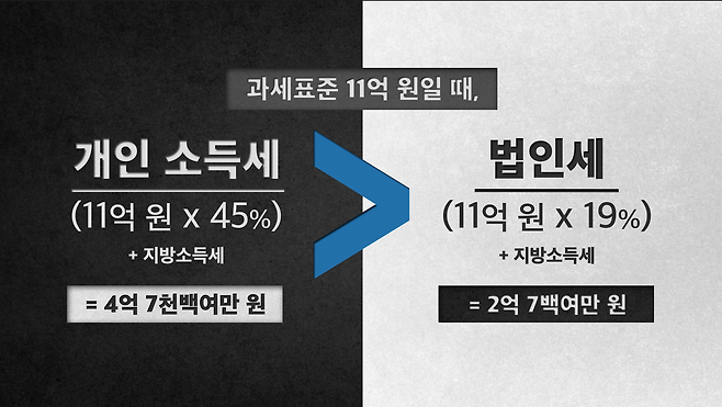 세금 부과의 기준이 되는 과세 표준이 11억 원일 경우, 개인은 45%, 법인은 19%의 세율 구간에 들어가게 돼 실제 내는 세금은 4억 7천백여만 원과 2억 7백여만 원으로 갑절 넘게 차이가 납니다. 소득이 클수록 차이는 더 커집니다.