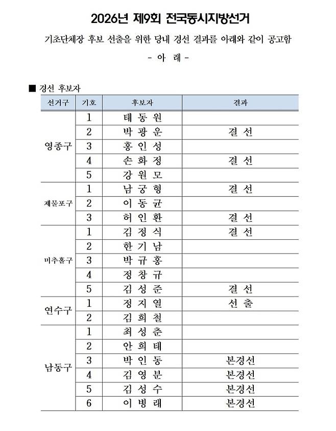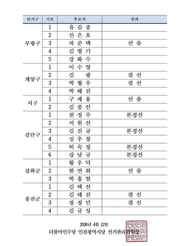 민주당 인천광역시당 선거관리위원회는 12일 저녁 제9회 전국동시지방선거 인천 기초단체장 후보 선출을 위한 경선 결과를 공식 발표했다.