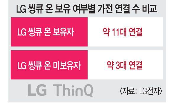 실제 AI 홈 허브 기기 ‘씽큐 온’ 보유자 중 절반 이상이 10개 이상의 가전을 연결해 사용하고 있다. 씽큐 온을 보유하고 씽큐 앱을 등록한 고객 기준으로는 평균 연결 대수가 약 11개에 달했다. 반면 씽큐 온 미보유 고객은 평균적으로 약 3대의 가전을 연결해 사용하고 있었다.