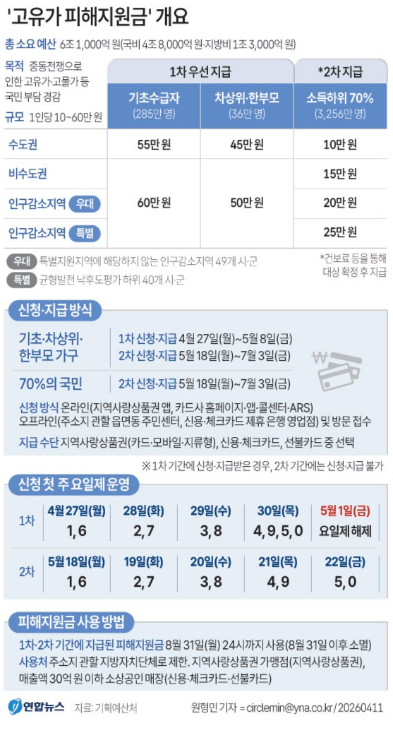 중동전쟁으로 촉발된 고유가·고물가에 따른 국민 부담을 덜기 위한 '고유가 피해지원금' 지급이 오는 27일 취약계층을 시작으로 이뤄진다.