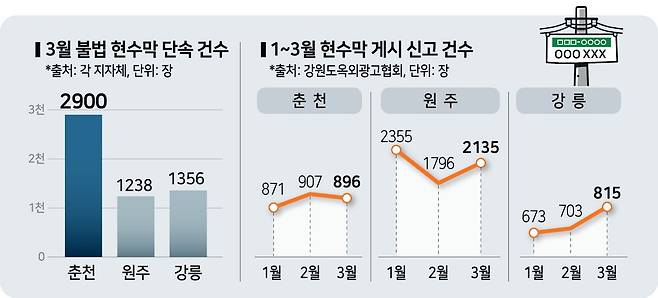 불법 현수막도 여전히 기승을 부리고 있다. 3월 기준 불법 현수막 단속 건수는 춘천 2900장, 원주 1238장, 강릉 1356장이다.