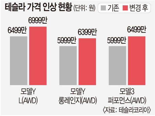 12일 업계에 따르면 테슬라는 지난 10일 중형 전기 스포츠유틸리티차(SUV) 모델YL(롱바디) 가격을 기존 6499만원에서 6999만원으로 인상했다. 지난 3일 국내에서 사전계약을 시작한 지 일주일 만에 500만원을 올렸다. 모델Y 롱레인지 AWD(5999만→6399만원)와 모델3 퍼포먼스(5999만→6499만원) 가격도 함께 인상했다.