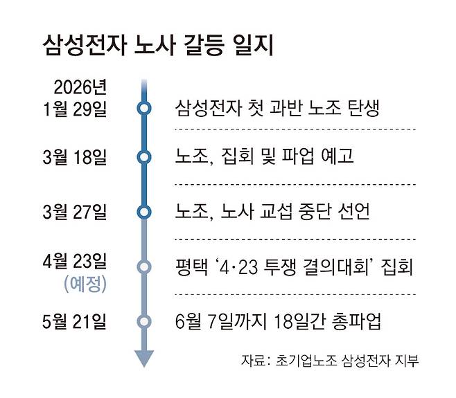 삼성전자 안팎에서는 삼성전자 파업이 현실화될 경우 한국 경제에 작지 않은 리스크가 될 수 있다고 보고 있다. 노조는 사측과의 입장 차를 좁히지 못해 교섭 중단을 선언했다. 23일 경기 평택캠퍼스에서 집회를 열 예정이다. 다음 달 21일부터 6월 7일까지 18일간 총파업을 예고했다. 삼성전자 과반 노조인 초기업노조 삼성전자 지부의 최승호 위원장은 “영업이익의 15%는 무리한 요구가 아니라고 본다”며 “인재들이 더 나은 처우를 위해 경쟁사나 해외로 떠나는 상황에서 회사 경쟁력을 위해서라도 성과급을 확대해야 한다”고 주장했다.