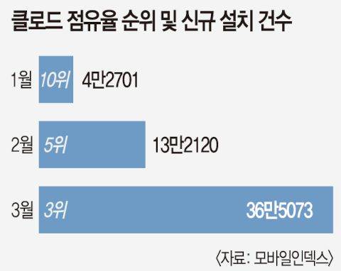 12일 데이터 분석 기업 아이지에이웍스의 모바일인덱스에 따르면 앤트로픽 AI 모델 ‘클로드’ 국내 신규 설치 건수는 지난달 기준 36만5073건으로 업종 점유율 3위를 기록했다. 지난 1월 10위(4만2701건), 2월 5위(13만2120건)에서 불과 두 달 만에 일곱 계단 상승한 것이다.