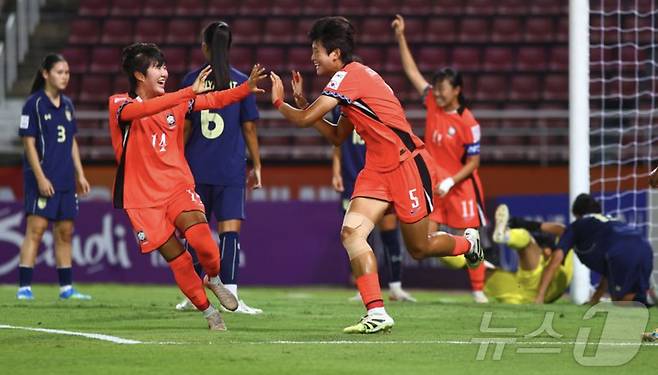 (서울=뉴스1) = 12일(한국시간) 태국 탐마삿 스타디움에서 열린 2026 아시아축구연맹(AFC) 여자 U-20 아시안컵 8강전 대한민국과 태국과의 경기, 대한민국 남승은(5번)이 전반 15분 코너킥 상황에서 헤더골을 성공시킨 뒤 환호하고 있다.