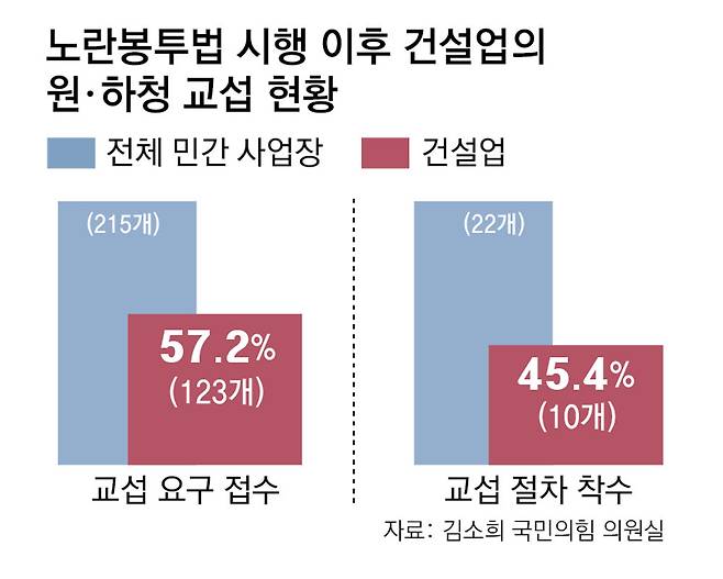 이미 법 시행 이후 민노총 산하 전국건설노조는 현대건설, 대우건설 등 상위 건설사 100개를 상대로 교섭을 요구했다. 이달 8일 현재 노동위원회에 접수된 민간 부문 교섭 요구(215건) 중 건설업이 57.2%(123건)를 차지한다.