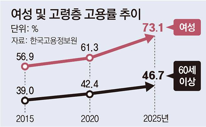 일하는 고령층이 늘어난 것도 고용률을 끌어올렸다. 2024년 기준 60∼64세 고용률은 64.0%로 경제협력개발기구(OECD) 평균(55.9%)보다 높았다. 65세 이상 고용률은 38.2%로 OECD 평균(16.2%)의 두 배를 넘었다.