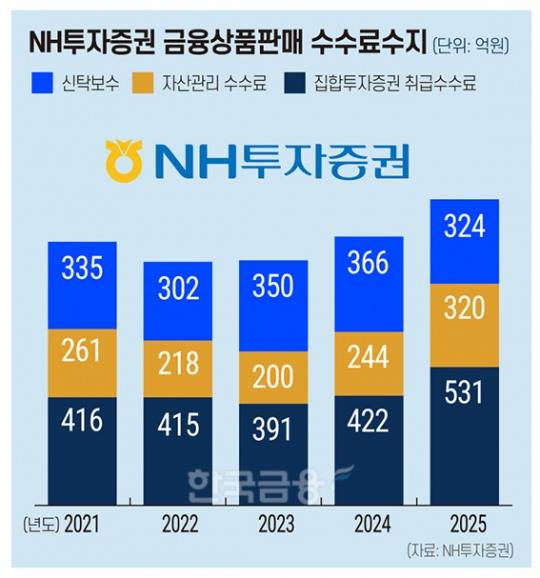 지난해 국내 증시 상승 영향으로 펀드, 랩 등 투자형 상품 판매가 확대되면서 집합투자증권취급수수료는 531억원으로 25.6% 증가했고, 자산관리 수수료도 320억원으로 31.2% 늘었다. 반면 신탁보수는 324억원으로 소폭 감소했다.