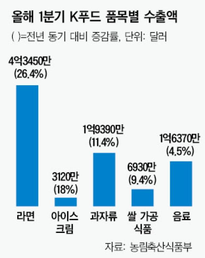 눈에 띄는 건 라면만큼 과자와 아이스크림 등간식 수출이 늘었다는 점이다. 같은 기간 라면(4억3450만달러)이 26.4% 증가할 동안 과자류(1억9390만달러)와 아이스크림(3120만달러)은 각각 11.4%, 18% 늘었다.