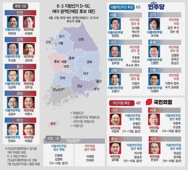 광역 5곳 ‘빅매치’ 성사…‘미니 총선’ 재보궐엔 눈치싸움 치열 [지선 D-50]