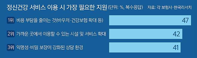 환자 수는 꾸준히 증가하고 있지만 실제 적절한 치료로 이어지는 데에는 경제적 장벽이 주요 한계로 작용하고 있다. 한국리서치가 지난달 성인 남녀 1000명을 대상으로 진행해 발표한 ‘정신건강에 대한 인식과 정책 수요’ 조사를 보면 응답자들은 정신건강 문제를 보편적인 현상으로 인식하면서도 실제 상담이나 진료에는 상당한 부담을 느끼는 것으로 나타났다. 특히 정신건강 서비스를 보다 쉽게 이용하기 위해 가장 필요한 지원을 묻는 항목에서 다수의 응답자가 ‘진료비 등 비용 부담 완화’를 지목했다. 치료비 지출에 대한 소비자의 현실적인 고민이 소액 단기보험이나 건강보험 내 관련 특약에 대한 수요 확대로 직결되고 있음을 보여주는 대목이다.