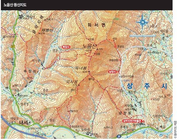 경상도란 이름의 '상'을 맡은 근본 있는 고장인 상주. 그 상주를 대표하는 산 중 하나가 갑장산, 천봉산과 더불어 노음산露陰山이다. 세 산을 일컬어 상산삼악尙山三岳이라 한다. 조선 중기 편찬된 <신증동국여지승람>에서는 노음산을 두고 '주 서쪽 10리에 있는 서의 노악'이라 평하며, '북의 석악(천봉산), 남의 연악(갑장산)과 함께 상산삼악이다'라는 기록이 전해진다. 예로부터 상주 대표 명산으로 이름이 높았음을 알 수 있다.