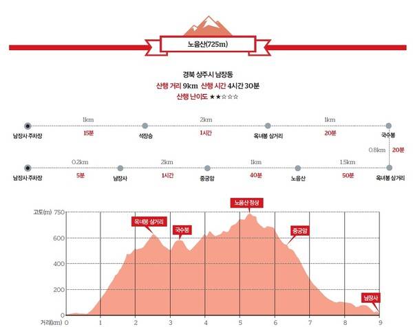 노음산은 경북 상주를 대표하는 산으로 암릉 조망과 부드러운 육산 숲길이 조화를 이루는 산이다. 남장사 주차장~석장승~암봉~옥녀봉삼거리~노음산~팔각정~중궁암~관음선원~남장사~주차장이 대표적인 코스며 역순으로 진행해도 무방하다.