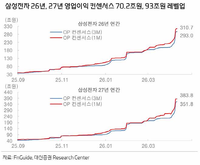 삼성전자(005930) 실적 관련해서는 1분기 영업이익 가이던스가 57조원으로 공개돼 컨센서스 평균인 40조원대는 물론 상단인 54조원마저 큰 폭으로 상회했다. 이에 2분기 영업이익 전망은 50조원대에서 70조원대로, 연간 영업이익 전망은 300조 원대로 레벨업됐다. 선행 PER은 5.32배로 레벨다운됐다. 오는 16일 예정된 TSMC 실적 발표와 23일 SK하이닉스(000660) 실적 발표도 반도체 모멘텀 지속 여부를 가늠할 분수령이 될 전망이다.
