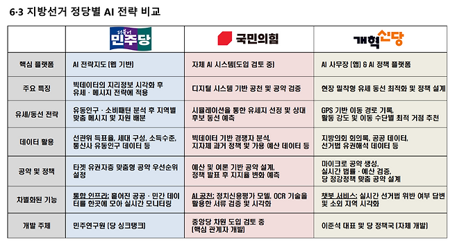 정당별 세부적 차이점을 들여다보면, 당 정체성과 맞물린다는 점이 두드러진다. 최근 주요 선거를 휩쓸고 있는 민주당은 이번에도 가장 빠르게 이른바 '전략지도' 플랫폼을 선보일 계획이다. 국민의힘은 공천 접수 단계부터 'AI 기반 정치신용평가 모델'을 도입하고, 경쟁자 선거 전략 분석과 공약 설계 과정까지 디지털화하는 변화를 시도하고 있다. 개혁신당은 이준석 대표 스스로 코딩 전문가이자 정치인으로서 선거에 필요한 정보와 기술을 효과적으로 접목했다는 평가를 받고 있다. 여기에 오픈소스로 공개한다는 점에서 개발자 마인드도 돋보인다.