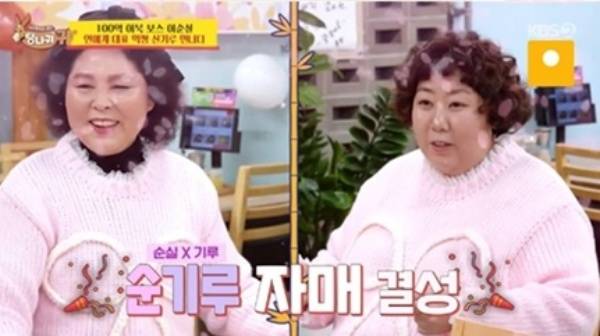한편 이순실은 개그우먼 신기루와 만나 거침없는 ‘걸크러시’의 매력을 과시해 눈길을 끌었다. 신기루는 이순실을 위해 주문 제작한 핑크색 커플 니트를 선물했고, 함께 사진을 찍으며 ‘순기루 자매’를 결성해 웃음을 선사했다. 이순실은 코다리조림, 녹두전, 평양냉면 등 한상 차림으로 화답했다.