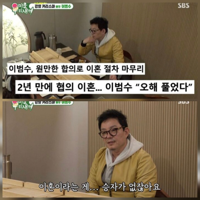 12일 방송된 SBS '미운 우리 새끼'에는 최근 합의 이혼 소식을 전한 배우 이범수가 새 멤버로 합류해 근황과 함께 솔직한 심경을 털어놨다.
