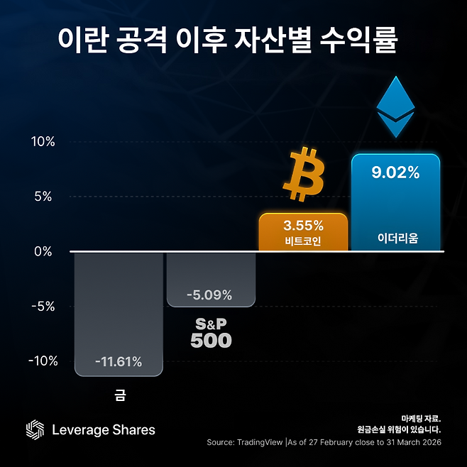 이란 전쟁 후, 미 증시도 금도 떨어졌지만…이더리움은 날았다 [레버리지셰어즈 인포그래픽]