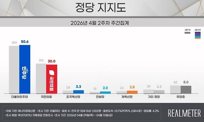리얼미터가 에너지경제신문 의뢰로 지난 9~10일 전국 18세 이상 1002명을 대상으로 진행해 이날 공개한 정당 지지도 조사에 따르면 여당인 더불어민주당은 50.6%로 전주 대비 0.7%포인트 올랐다. 국민의힘은 1.3% 하락해 30.0%를 기록했다. 조국혁신당은 0.5%포인트 상승한 3.3%, 개혁신당은 0.5%포인트 오른 2.8%, 진보당은 0.5% 상승해 2.0%였다.