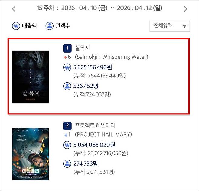 전날 '살목지'는 197,690명의 관객을 동원하며 박스오피스 1위 자리를 지켰다.